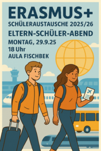 Am 29.09.2025 laden wir alle interessierten Schüler*innen und Eltern zum ERASMUS+-Abend ab 18.00 Uhr in die Aula-Fischbek ein.